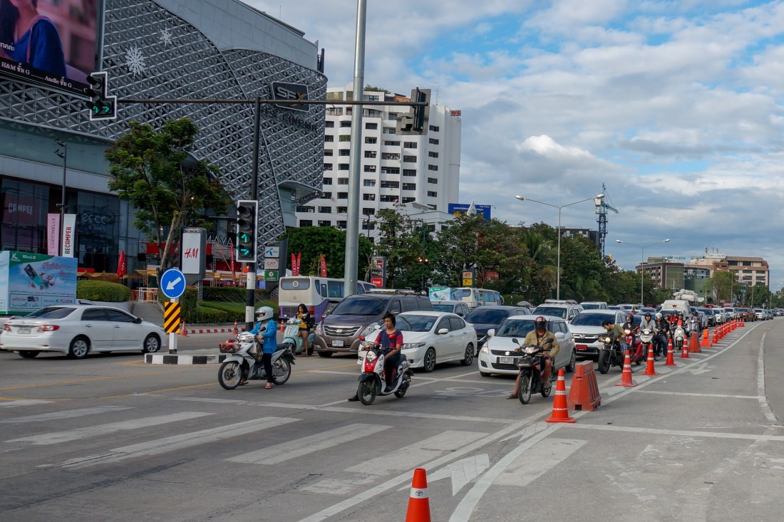 Traffic here is intense. It is one of the most polluted cities in Thailand, its only real downside. Many people wear masks if they are on a bike, as when you stop at a red light it can easily be 5 minutes until it changes, you can taste the pollution. The cars stop and build up in the queue the bikes weave their way to the front and wait in ever increasing numbers waiting for the green light. Then they are off, everyone trying to get ahead of the cars which eventually catch up and overtake until the next red light where it all happens again. It is strangely exhilarating and frightening at the same time. Thailand has the worst death rate on the roads in the world and the holiday periods especially New Year is when most fatalities occur. They only count deaths not the many thousands injured, it’s horrific. If you are here in the holidays you see lots of young Thais enjoying themselves and drinking beer with shots and then jumping on their motorbikes to go home. Car drivers are the same, lethal. We don’t venture out on the bike at this time it’s not so bad in the middle of the day but never at night it’s too dangerous.
