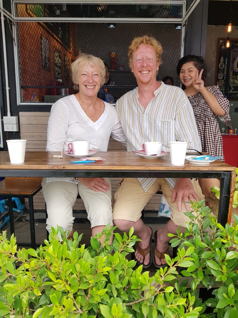 We needed a coffee and found a small coffee shop away from the temples. We ordered in our best Thai, which always gets a giggle, and sat down. They brought us home made biscuits and made us feel very welcome. One of the girls asked if she could have a photo of us. I don’t suppose they get many pale eyed, pale skinned ginger aliens in that part of town!! Children stare and we had one kid almost fall off his bike, mouth open looking at us. It’s all good fun. It happens a lot.