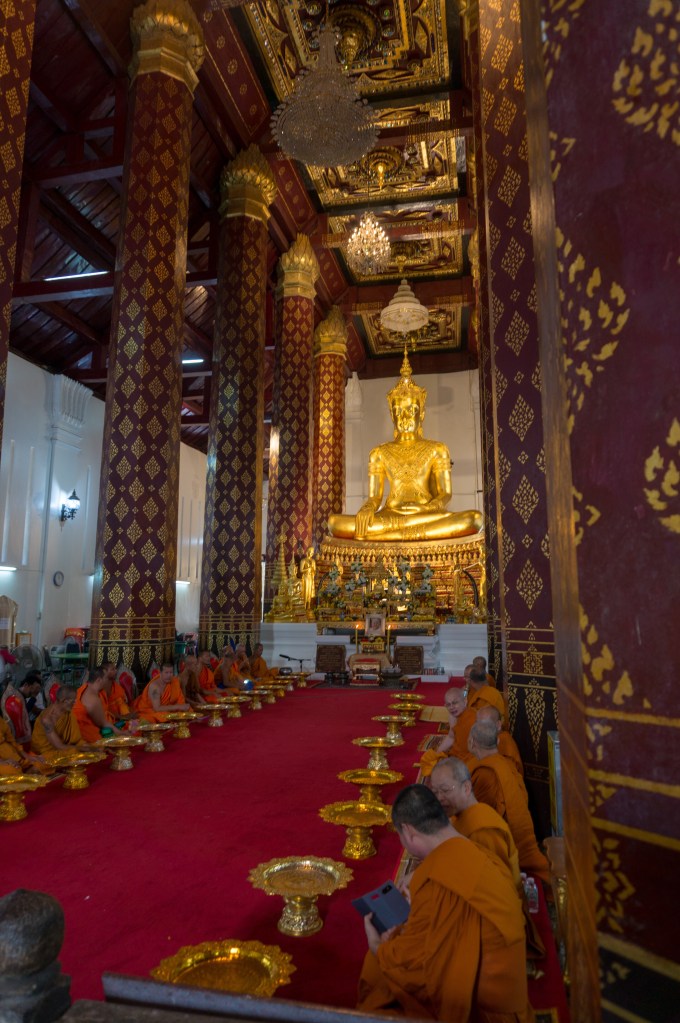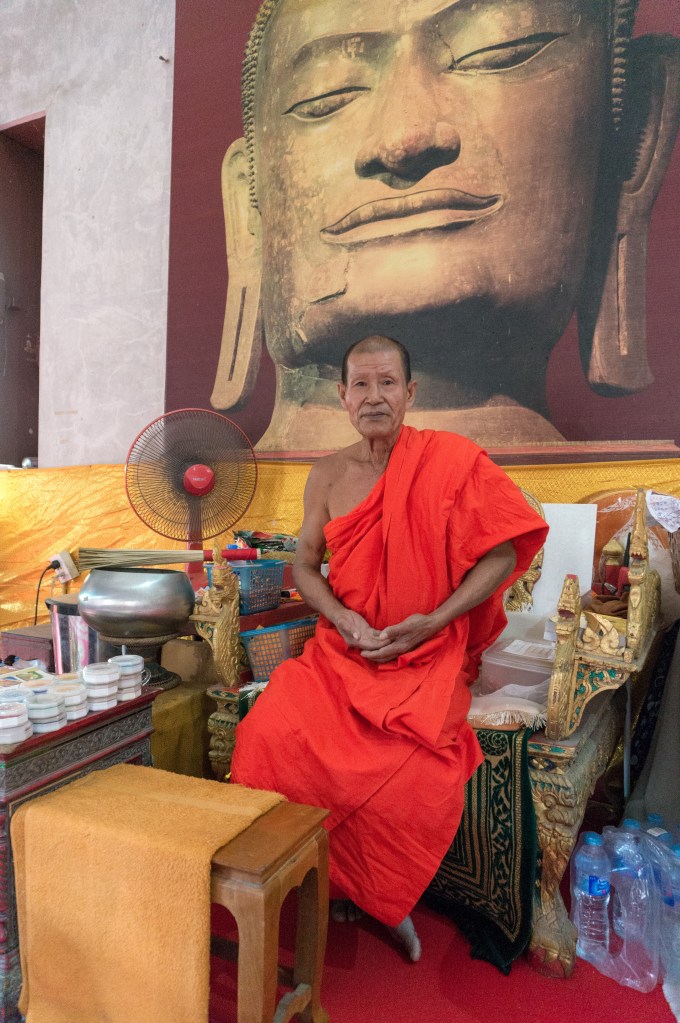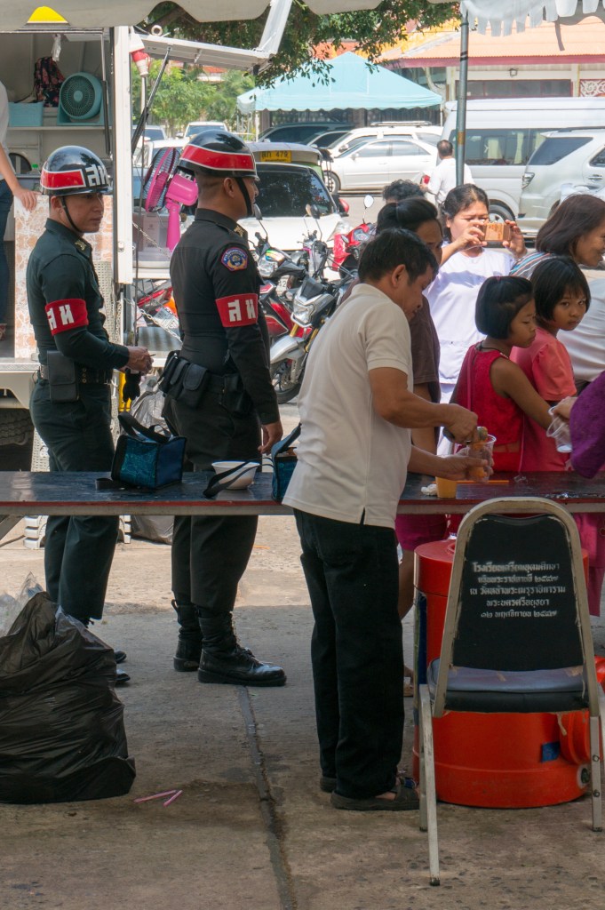 We cycled to a very big Temple called Wat Na Phra Men which was having a big celebration. Everyone is so inclusive. A girl came up to us and said it was a big day and there was free food and we were very welcome. There was a huge array of fruit in front of the temple and lots of blessings and inside the Wat all the monks were sat waiting for something, we know not what ( that’s a temple joke)……We looked at one stall and someone said free ice cream and asked where were we from. We said England and the whole long queue said welcome and have ice cream. We moved to the back of the queue; we know how to queue in England, but we were still given big pots of mango and coconut ice cream before everyone else got theirs, they are lovely, kind people. Even the very smart looking policemen queued.