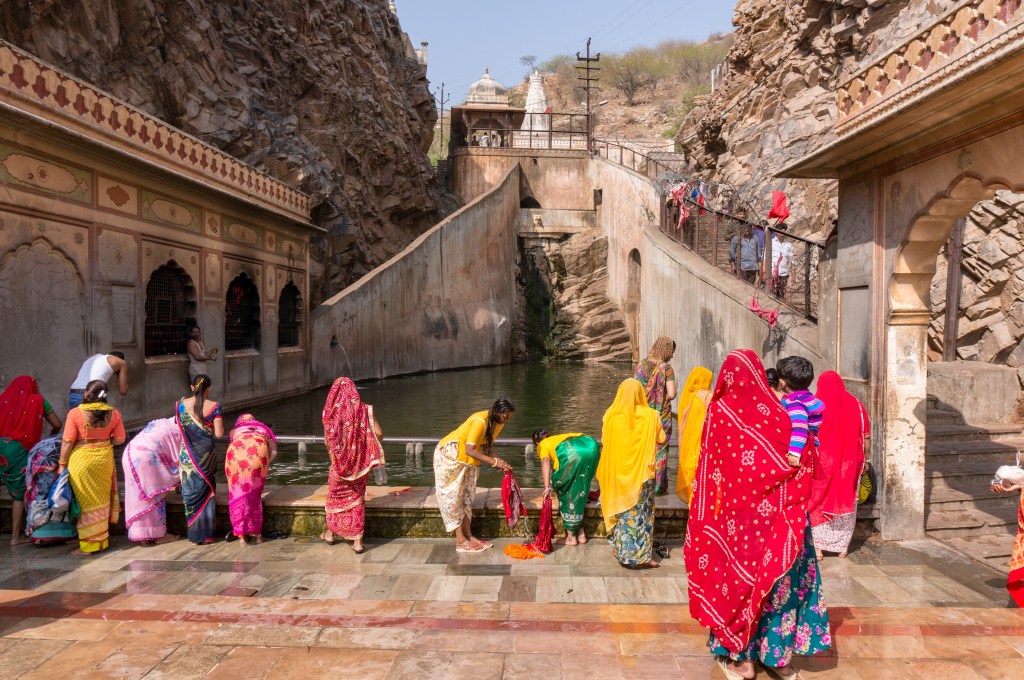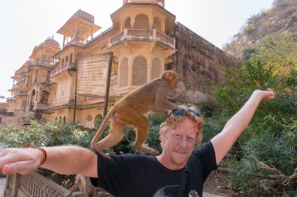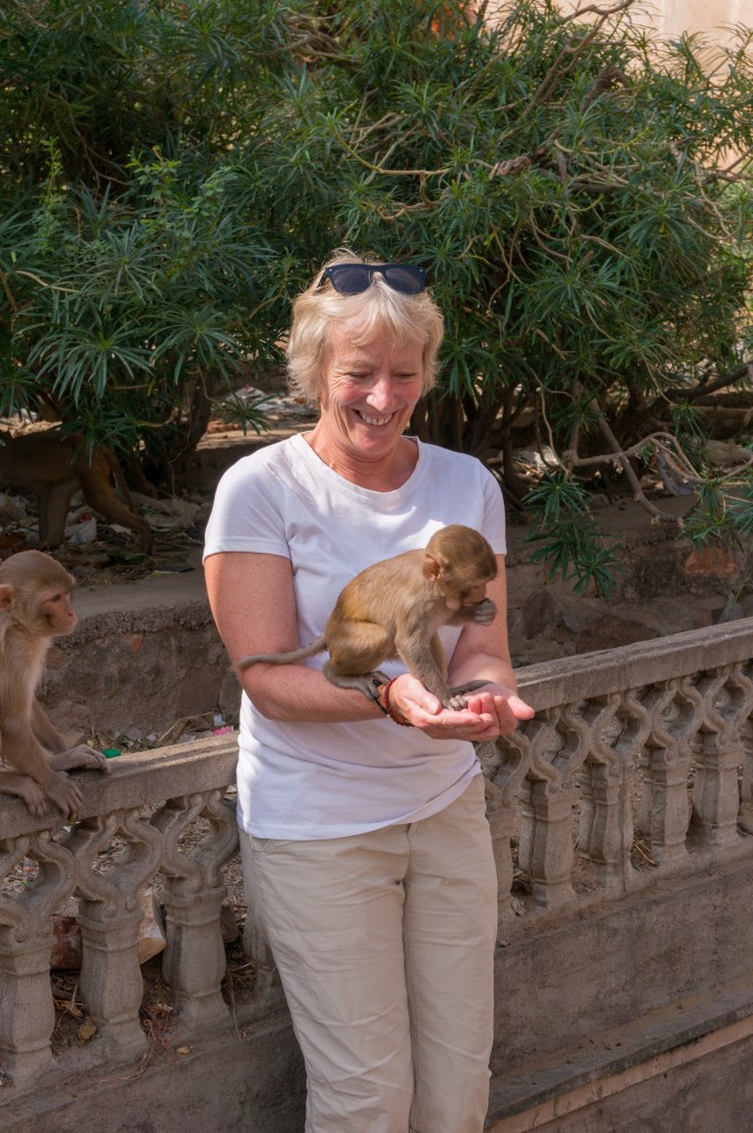 We left town to visit the Galta Temple, a Hindu Temple high on a hill. It has 3 pools fed by a sacred natural spring. People come to bathe in the waters and pay homage to Surya the sun god. It is also called the monkey temple. We stopped on the way to the temple and picked up Kanhaiya Sharma otherwise known as the ‘monkey man’. He is famous for being on a BBC documentary and a National Geographic programme about monkeys called ‘monkey thieves’. Such a nice guy who is a real life monkey whisperer. As we approached the temple the monkeys saw him and started to follow. He got some peas in pods off a vendor and we had to hold our arms out and hold the peas with a closed hand. The monkeys first sat on your head and then made their way along your arms to the booty. They prised your fingers open to get the peas. It was good fun. I only wish I didn’t have a white t shirt on! We stayed chatting and drinking chai with Kanha a very interesting man.
