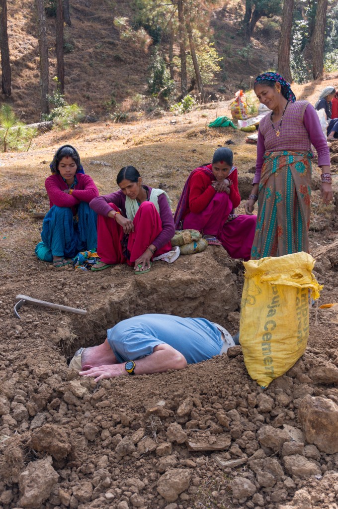 They mix it with cow dung to bind it and have to water it every 2 weeks to keep the dust down. They carry 35 kilos on their heads and they are only skinny little things. It was a big social group of women who laughed like drains when we tried to pick up the bags. David got down a hole and started digging they were very impressed and all giggled. Women carry huge weights of feed for the cattle and bedding on their heads it’s very impressive.