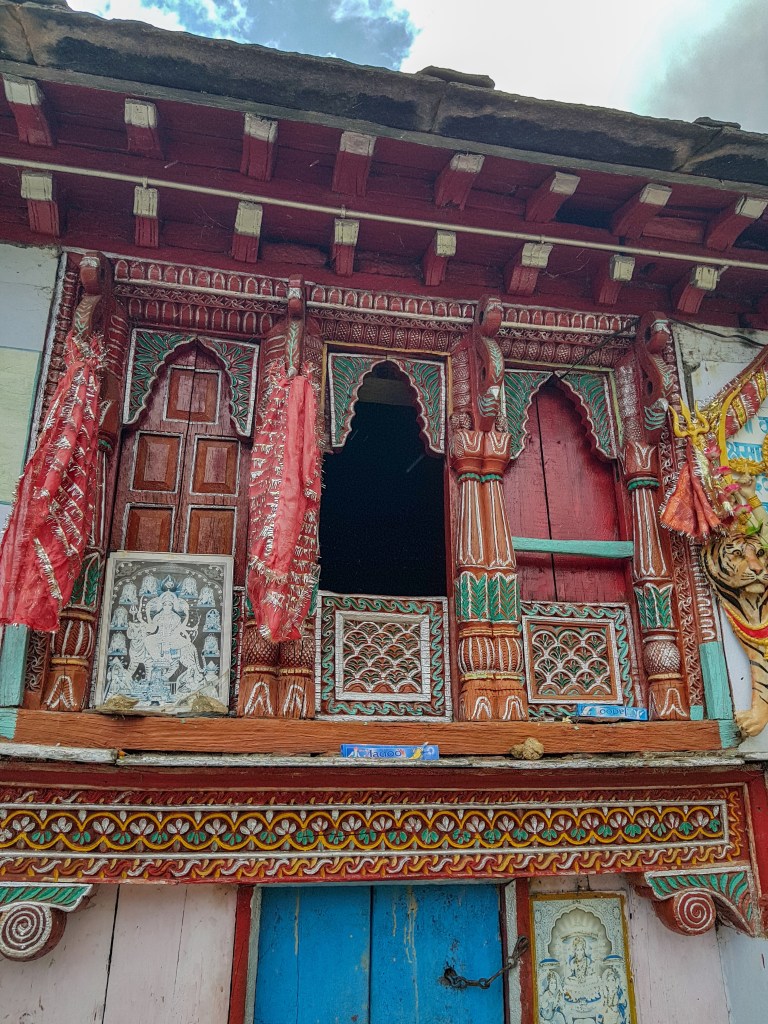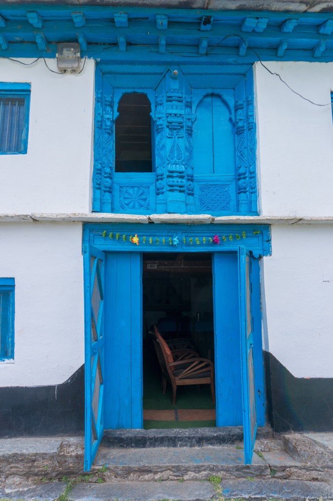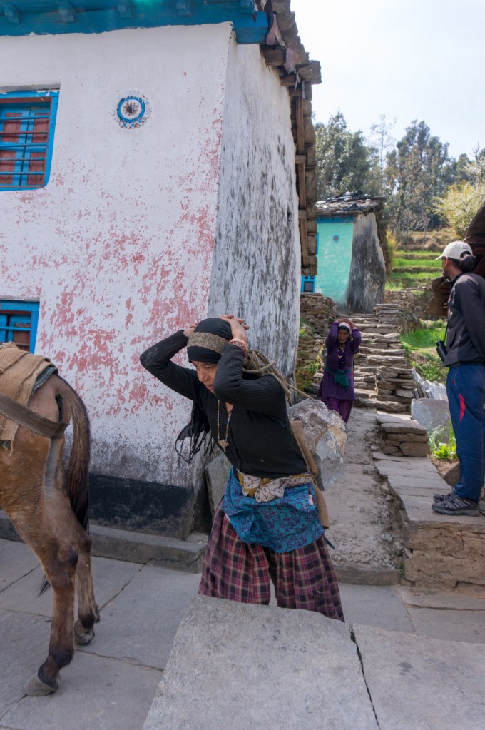 We started after breakfast walking to the top part of the village, a 3k walk up. It was a fantastic view. It is also much higher than Binsar at 2100m we felt it in our lungs. My nose bleeds when I am high up. We came back down for lunch, the food is a lot different here we had spaghetti, slightly spicy, rice with cabbage and some fruit. In the afternoon we explored the main part of the village with the oldest house, built in 1701. The woodwork was beautiful. The villagers are friendly and shy and hardworking. The women carry huge chunks of rock with a band on their heads and ropes around the rocks and flip flops, they are incredibly hardy folk. There are a few new stone houses being built and the women are the labourers earning very little for backbreaking work.