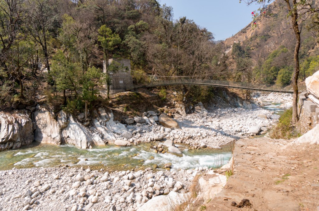 We went on a walk down to the bottom of the valley and the Pindar River. The river comes from the Pindari glacier and many many kilometres downhill flows into the Ganges. We crossed wobbly iron bridges and went right down to the waters edge sitting on huge rounded boulders.