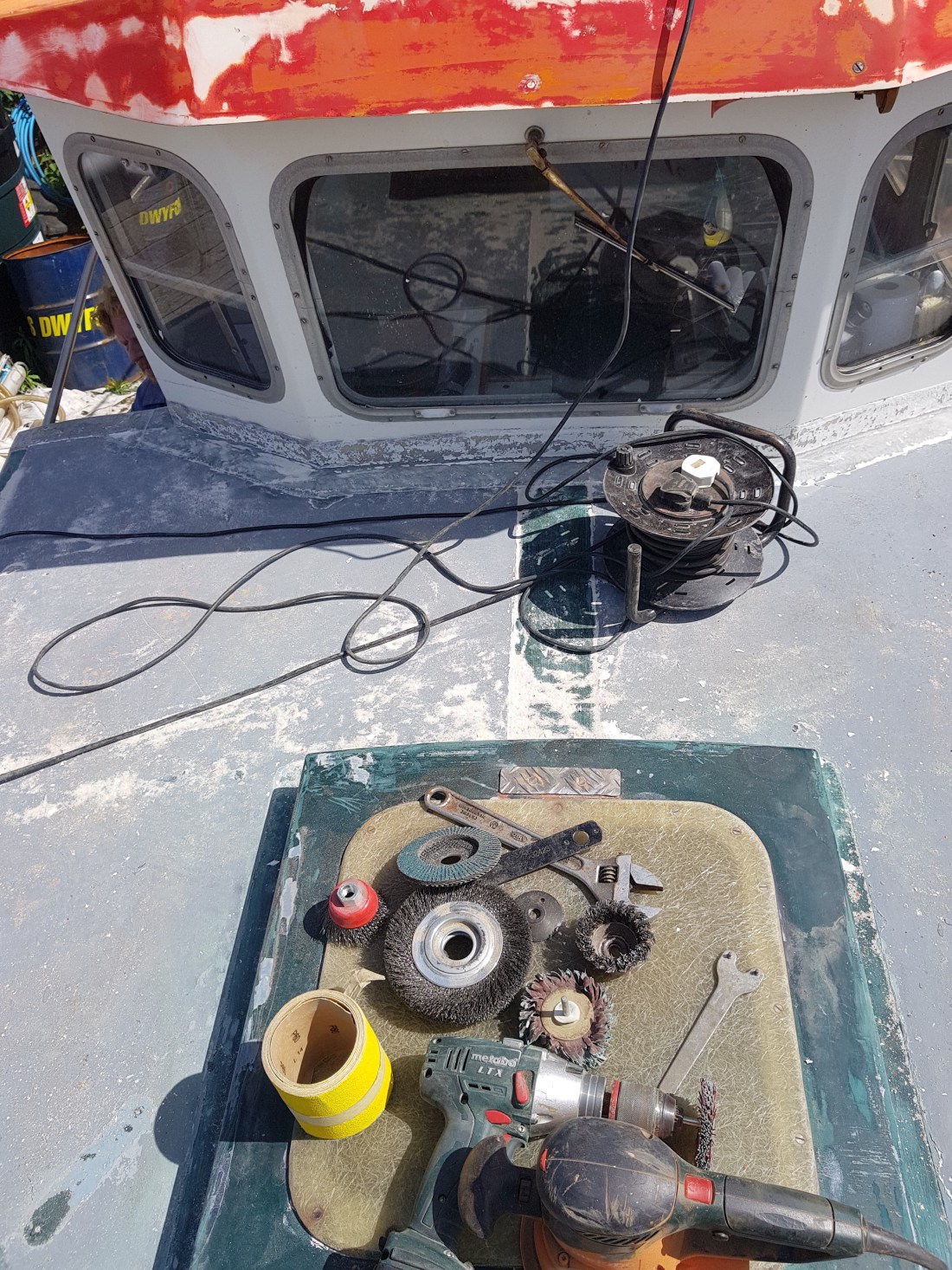 We started by sanding off all the paint above the waterline, 2 coats and this took us 3 weekends. We both looked like Smurf’s at the end of the day much to the amusement of the guys who work in the boatyard.