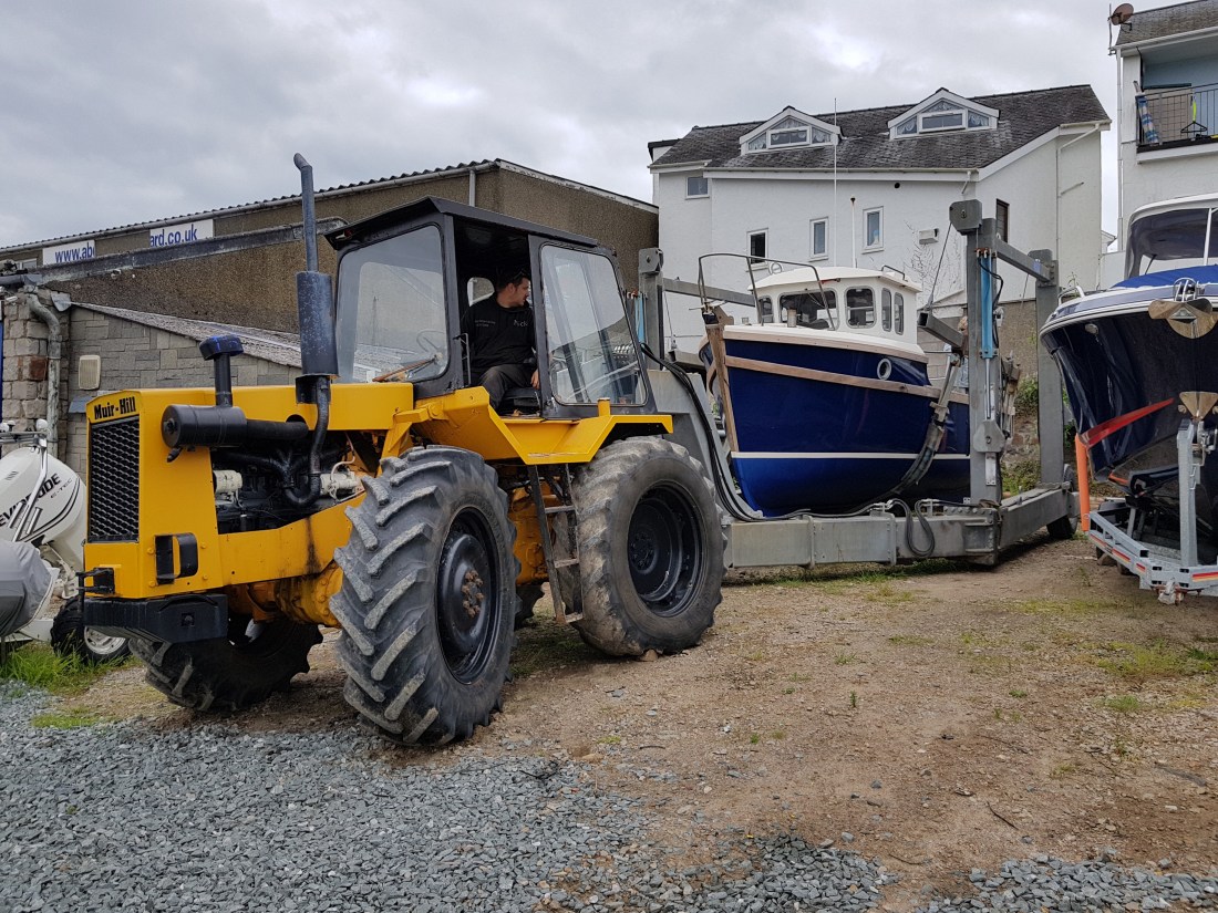 We arrived in Abersoch at 1.30am after watching Bill Bailey (which was very funny) in Warrington at the Parr Hall. We went to bed after a cup of tea and after only 5 hours sleep were in the boatyard waiting to go in the water. We put the dinghy and outboard on the boat and were moved towards the water in the hoist pulled by a tractor, which is always an interesting ride.