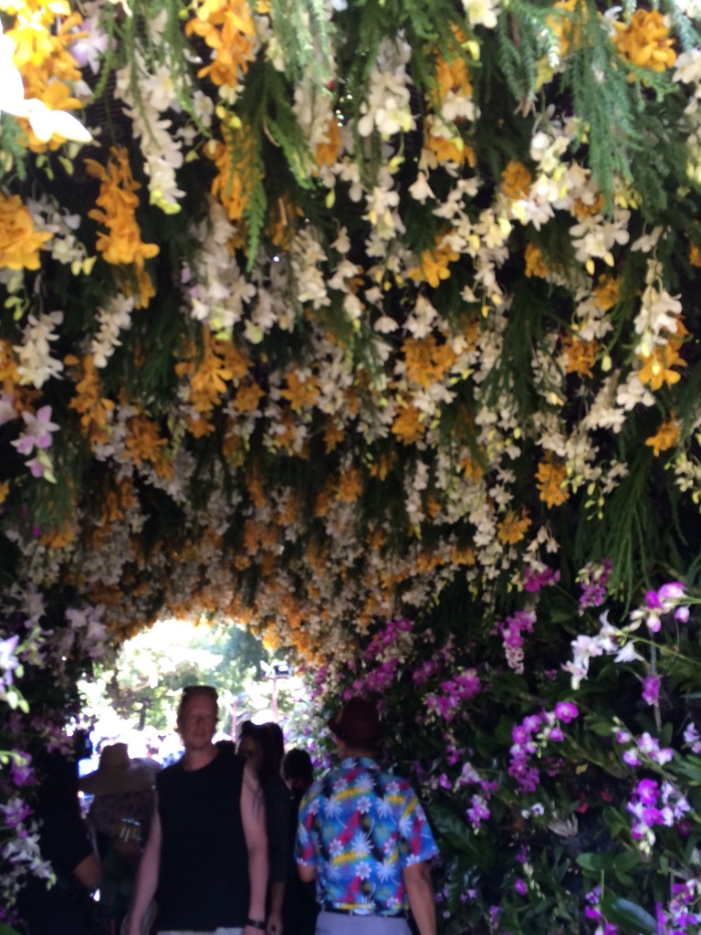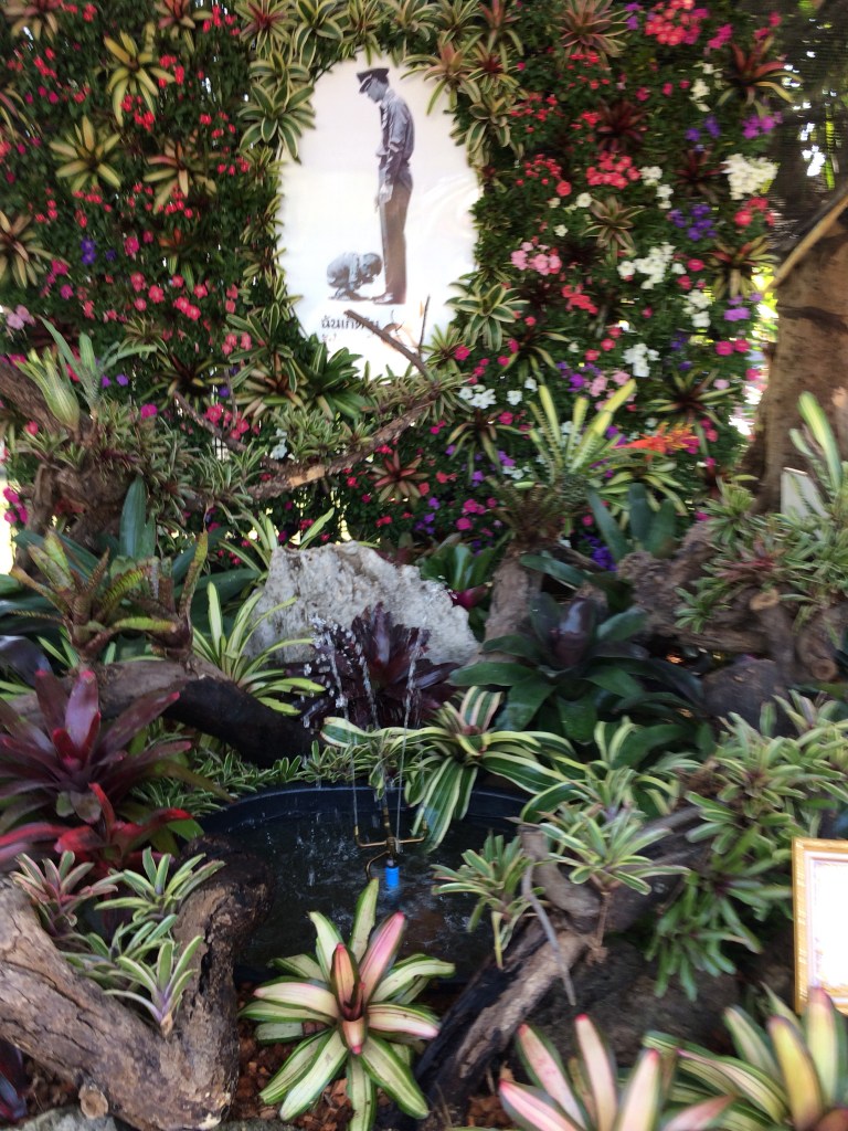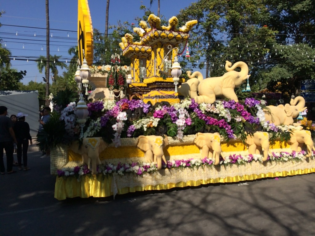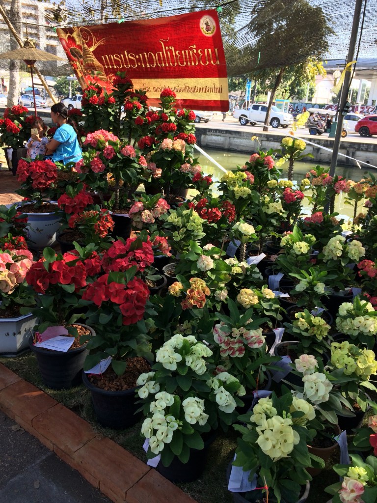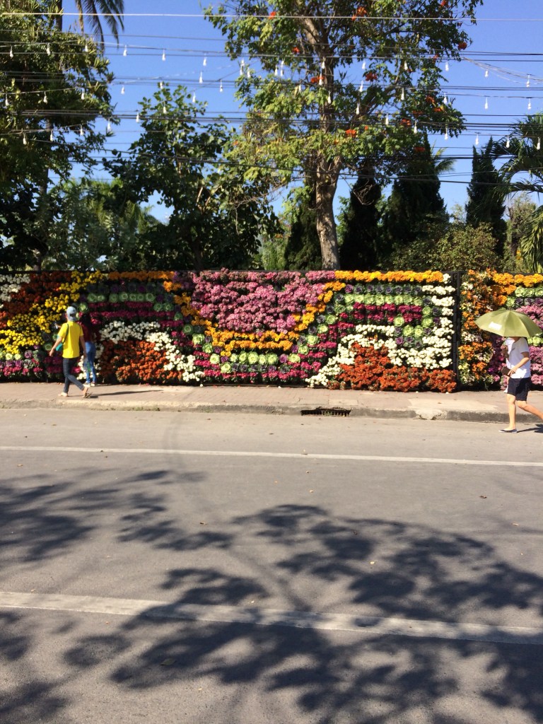 We cycled to a very big Temple called Wat Na Phra Men which was having a big celebration. Everyone is so inclusive. A girl came up to us and said it was a big day and there was free food and we were very welcome. There was a huge array of fruit in front of the temple and lots of blessings and inside the Wat all the monks were sat waiting for something, we know not what ( that’s a temple joke)……We looked at one stall and someone said free ice cream and asked where were we from. We said England and the whole long queue said welcome and have ice cream. We moved to the back of the queue; we know how to queue in England, but we were still given big pots of mango and coconut ice cream before everyone else got theirs, they are lovely, kind people. Even the very smart looking policemen queued.