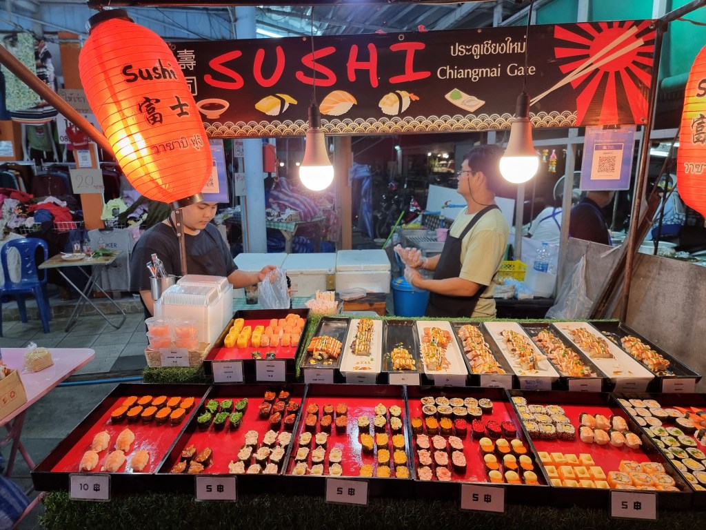 There are hundreds of street stalls with sushi at around 10p a piece and lots of stalls selling barbecued pork, prawns, chicken and meats I have no idea what they are! There’s fried chicken and lots of veggie options on sticks, duck soup all cheap and plentiful. We’ve never had any problems eating off the street food stalls.