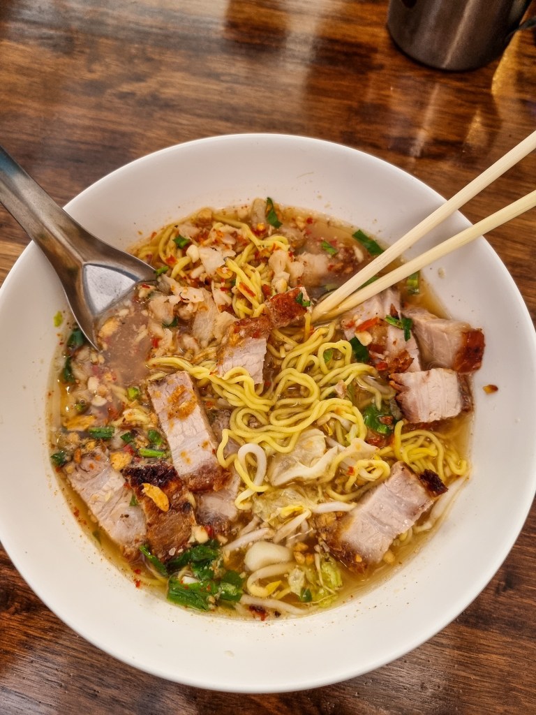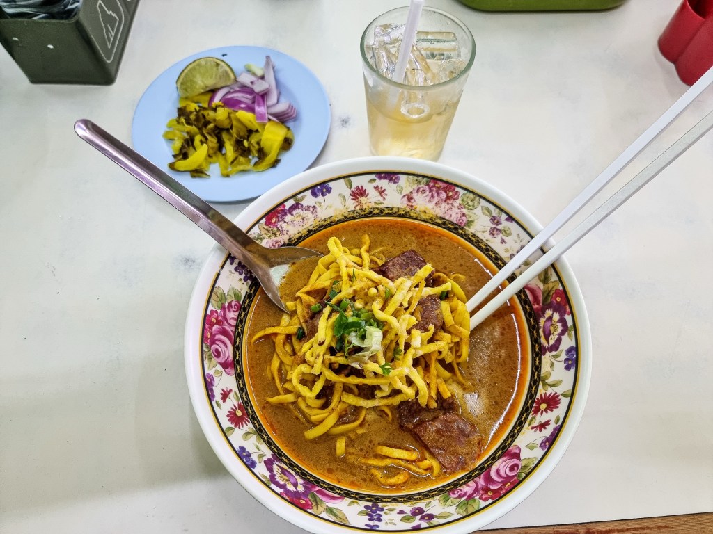 The classic Thai dishes of Pad Thai, pad krepow, fried rice are on every eateries menu and cost as little as £1 it’s all good. Noodle soups are a lunchtime must have, spicy noodle loveliness.