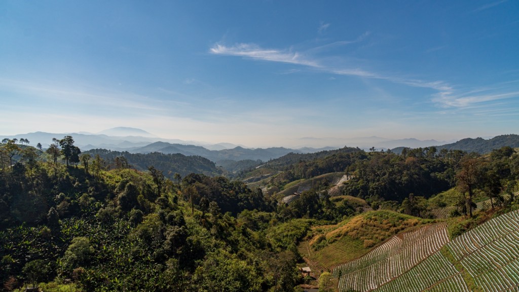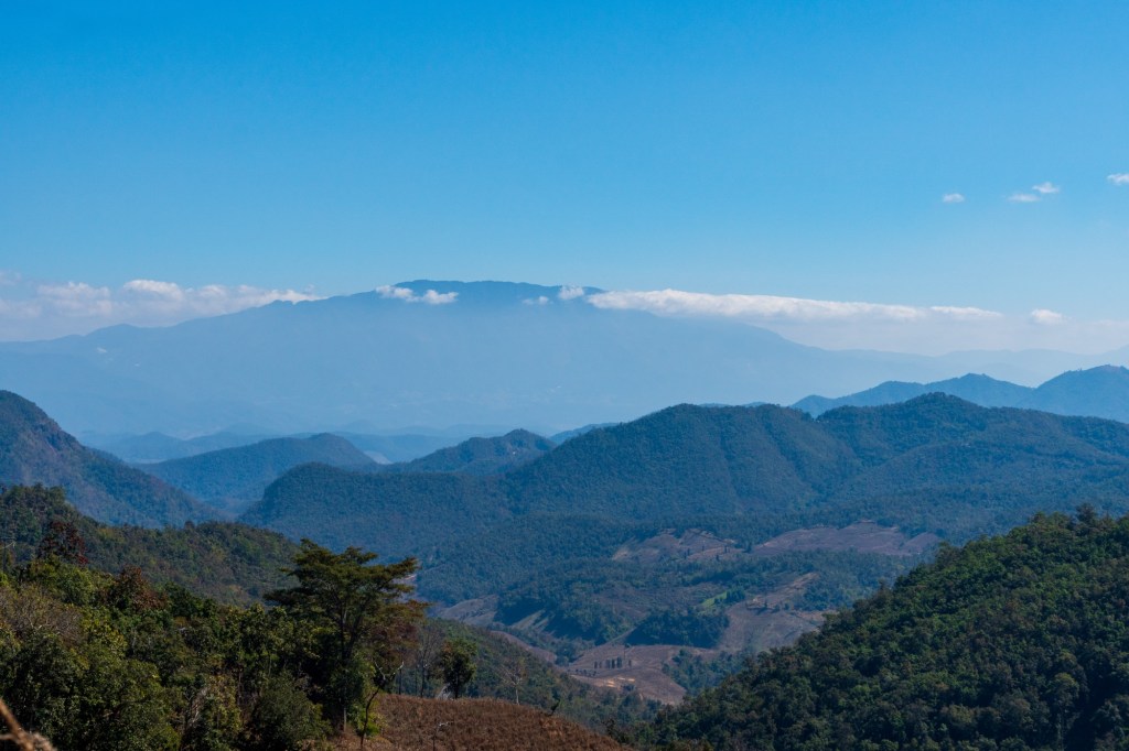 Dense pine forests and evergreen trees are often over 1000m. It used to be rain forest but logging and farming have changed it. Opium was one of the main crops in the high mountains for the hill tribes but no longer.