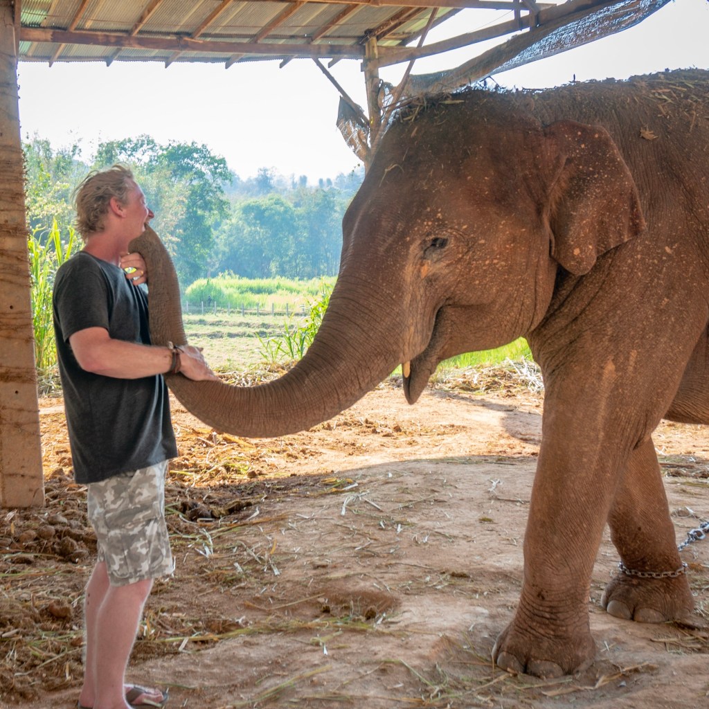 The guy in charge listened to our story, the elephant we called Vissa was actually Fa Sai, born in 2008. Her name means clear sky. He said if we took a walk to the camp base the mahouts would bring her so we could see her. We were taken to a clearing over a very wobbly bridge. There were modern little huts where you could stay overnight, the whole place had been transformed.