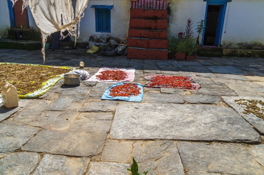 Passing peoples gardens with crops drying in the hot sun, chillies, lentils and maize spread out.