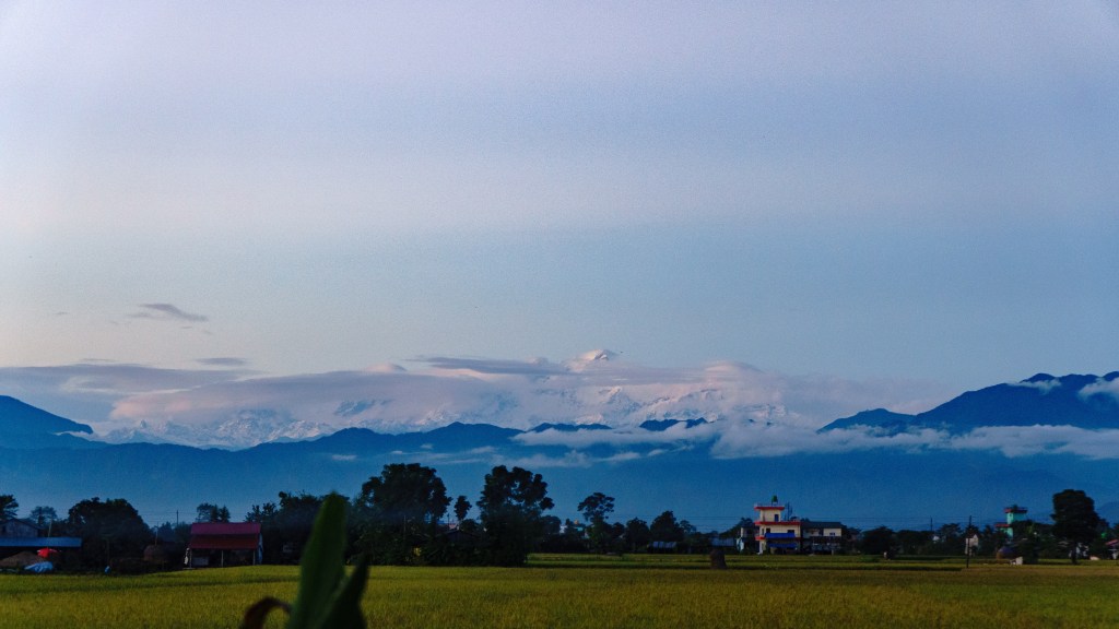 We were greeted with a drink of juice and later ate a simple dinner of organic vegetable curry, chipatis and daal. Because the monsoon has just finished (mostly) the mountains can be shrouded in mist, and were, so the next morning we got up early, 5.30 before sunrise and went to the village viewpoint to see the majestic Himalayas.